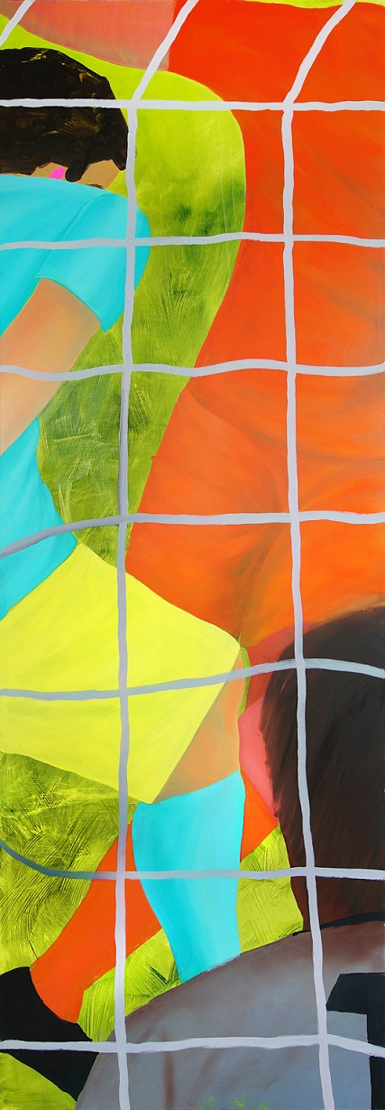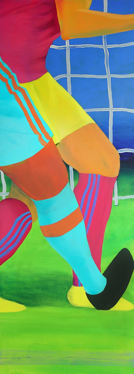 Sexuality is another fundamental issue in Ana Segovia’s survey. In sports, especially in sports like football, there is a lot of physicality: during a match, all the footballers embrace each other and clash against each other. In these paintings, the artist captures some moments characterized by close body contacts. In works like “It’s a Little Too Rough”, “Your Love is Nothing I Can’t Fight” or “Cus Its a Hard Life with Love in the World”, the figures are caught in goal celebration hugs, where Segovia underlines the erotic side as predominant element of the scene, as the titles suggest. “Can’t Sleep with the Man Who Dims My Shine” is the first solo show of Ana Segovia at the gallery.
