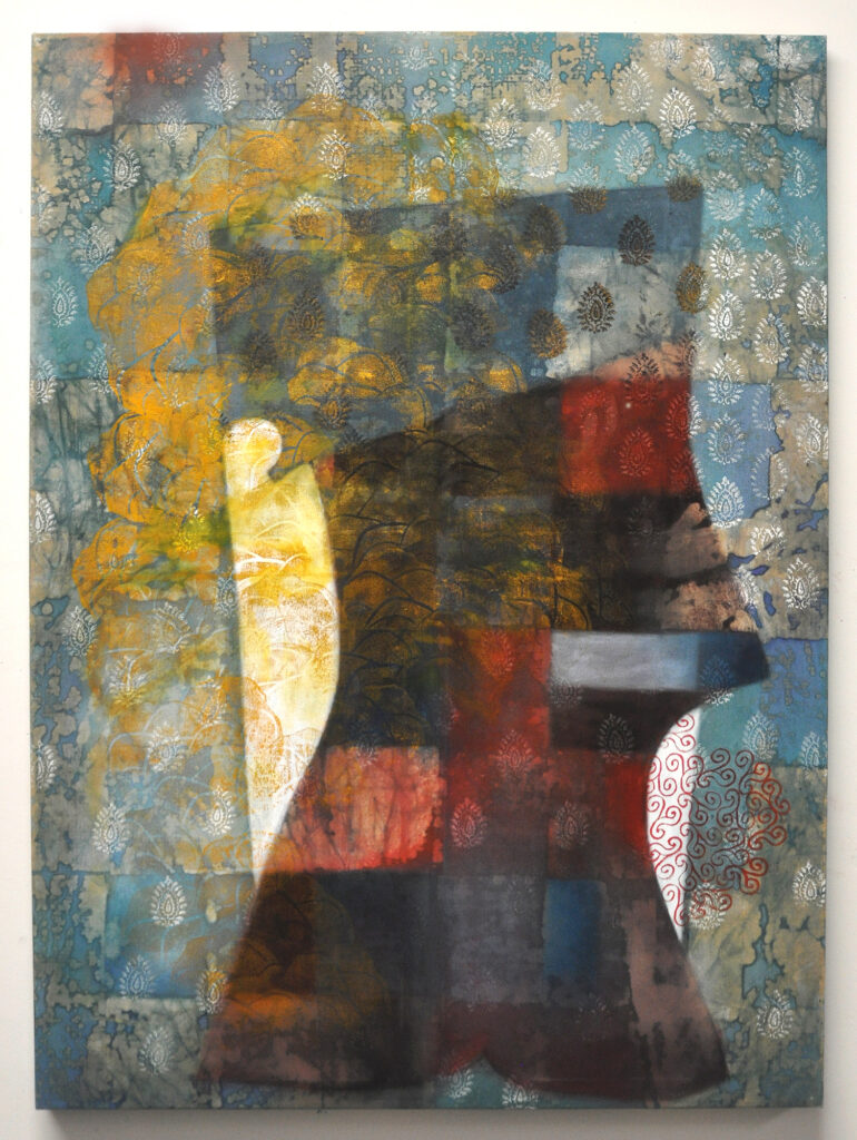 Complicating the reading of pictorial hierarchy by engaging pattern as a narrative tool, Lee establishes a new approach to abstraction with her “about face” alternative to easel painting’s “painting as window”. Her paintings resemble jaali—the ornamental, latticed screen that functioned as a window for centuries in the non-West. Patterned light pierce through from the back side of the painting, flooding rather the viewer’s space. Lee engages in deep art historical dialogue with the hegemony of male, European modernists like Matisse who drew from the visual vocabulary of the imaginary Orient.