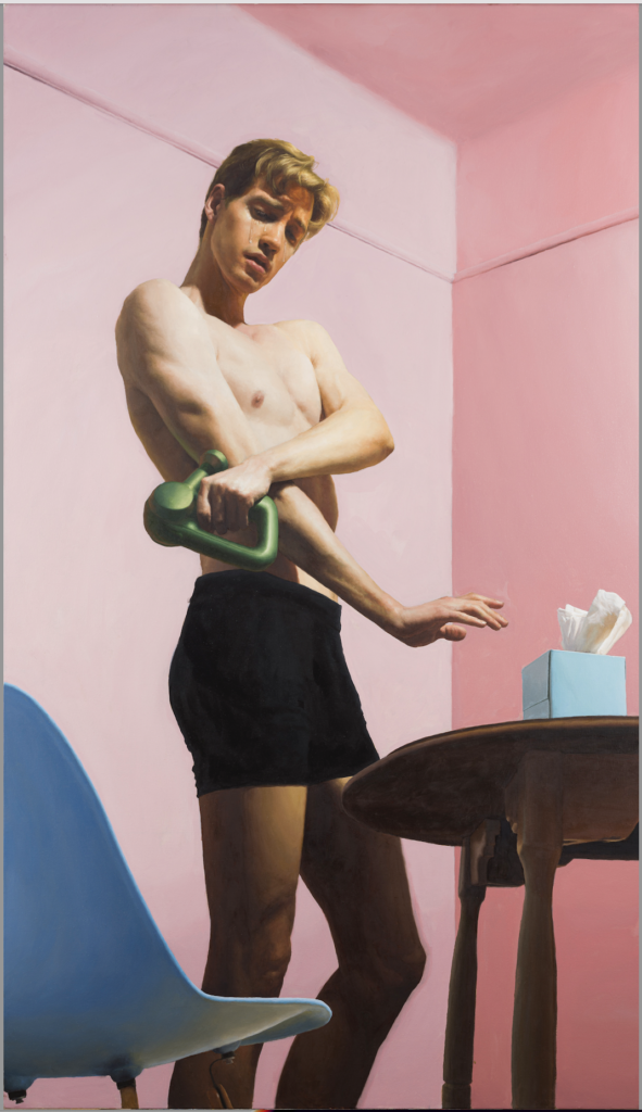 “My recent paintings explore masculinity, romance, and how they interact with each other. Growing up in Reno, Nevada (not exactly a progressive bastion in the 90s) I felt a strong social pressure to behave and present in a way that didn’t feel authentic to me and it’s taken a long time to feel comfortable with who I am. It’s ok to cry, it’s ok to wear pink, it’s ok not to have some absolute rigid definition of what I find attractive and what my relationships look like. The paintings serve as an affirmation that it’s ok to be the kind of man I am. I want to make work that a teenage version of myself could see and feel emboldened to accept himself. A lot of the culturally toxic tropes about masculinity apply specifically to hetero relationships and how men should interact with women, so the recent work is traversing how to conduct a partnership in the modern day.