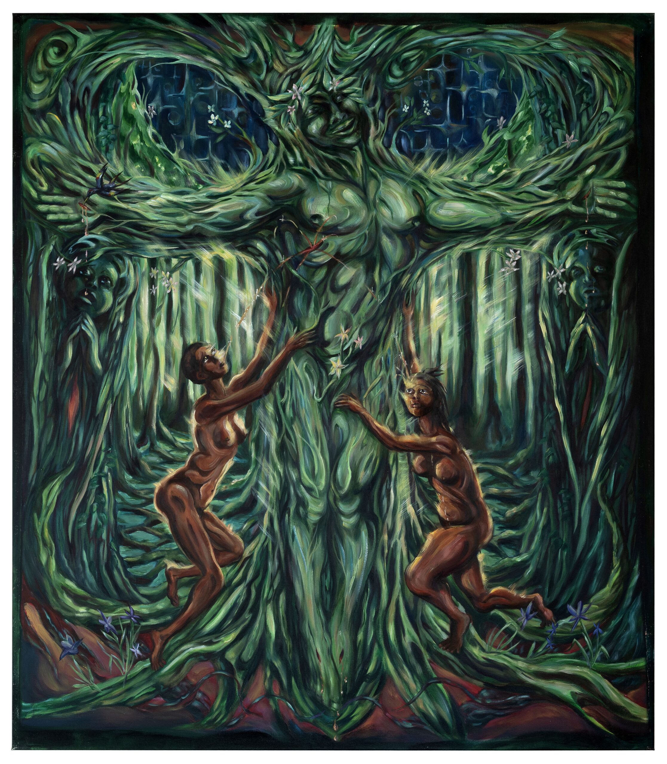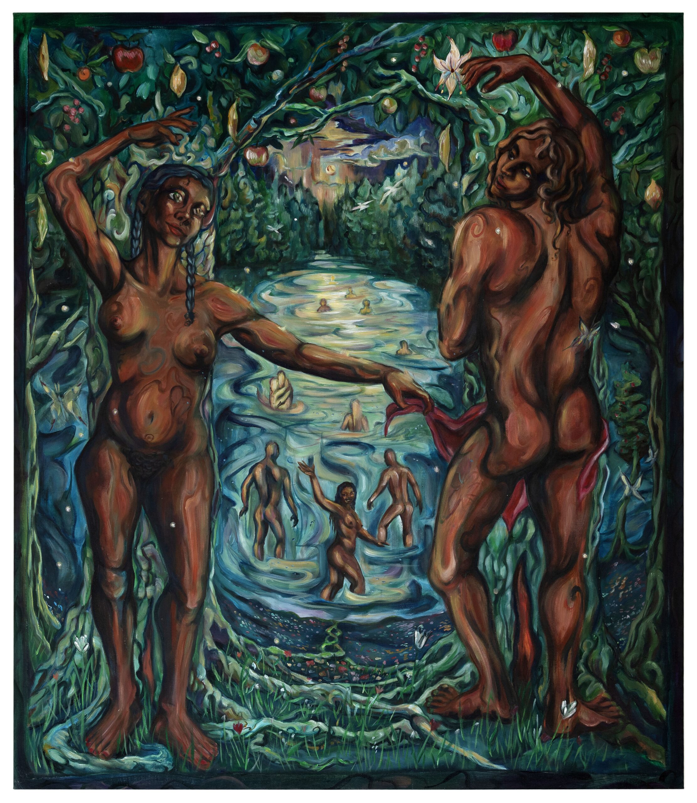 Her time was spent differently, but life is still an investigation for Eden. These paintings both display the findings and add to the unending vista of evidence. The lyrics of Nature Boy are in a narrative form, which appealed to Eden‘s life-long fascination with story-telling. It surely must be one of the oldest means of preserving and sharing information, perhaps because beauty, strangeness, pathos, and fun are excellent carriers of knowledge. The eight paintings in Nature Boy are but mere additions to a lineage that very well may extend back to when humans could first fathom time. They synthesize stories from around the world, varying traditions and numerous veins of mysticism with the artist’s personal tales. A backpacking trip the artist took connects to the arduous route a priest in Tigray must take to get to a holy site, a night of friends skinny-dipping is at once an echo of The Fall and Ovid’s account of the creation of the Salmacis fountain. These paintings emanate from the heart with the mind as a passenger, rather than the other way around. “The greatest thing/You shall ever learn/Is just to love/And be loved in return.” It was the recognition of the song’s closing lyrics, once dismissed as frivolous romance by the artist, that allowed these paintings to be born. The acceptance and embodiment of this sung adage marks the artist’s coming of age as a painter and person, and she is now a both grown woman, and the Nature Boy.