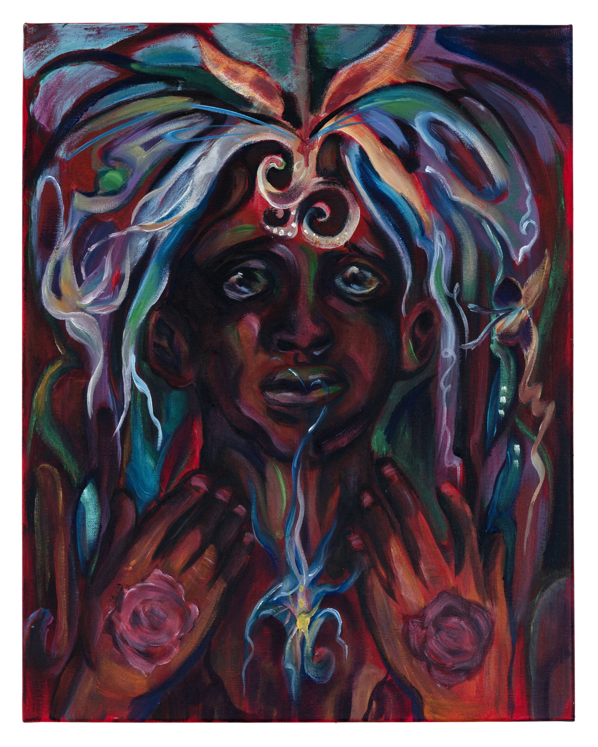 Eden Seifu was born in 1996 and lives and works in Seattle. On this occasion Seifu presents a new body of paintings that start a new direction in her practice and are imbued with new meanings and references, even though her style is always recognizable. Wether working on a large scale or small size, every work conveys a strong energy nourished by mysticism, by the relationship between man and nature and by the personal story of the artist, combining elements that remind something magic and ancestral.