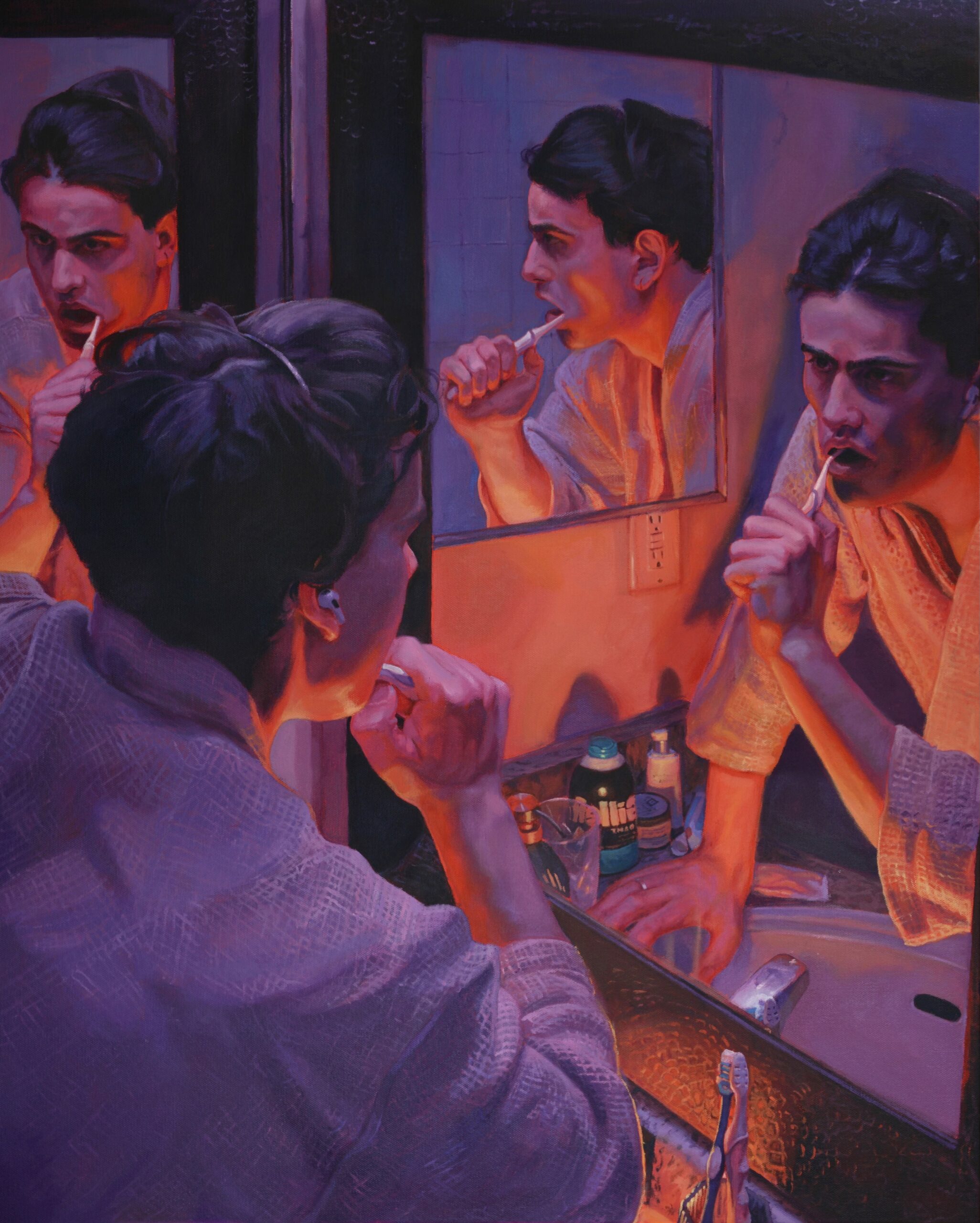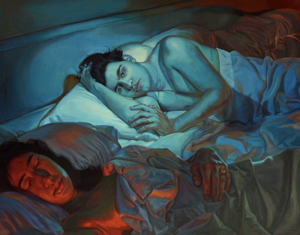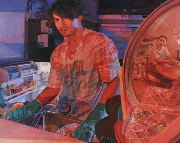 The exhibition presents five new works, going from mid-size to large scale paintings, all depicting private domestic moments. Every scene represents the artist himself and his wife, caught in common acts like washing dishes or doing the laundry, as part of a daily routine, seen by the artist as a comfort zone.