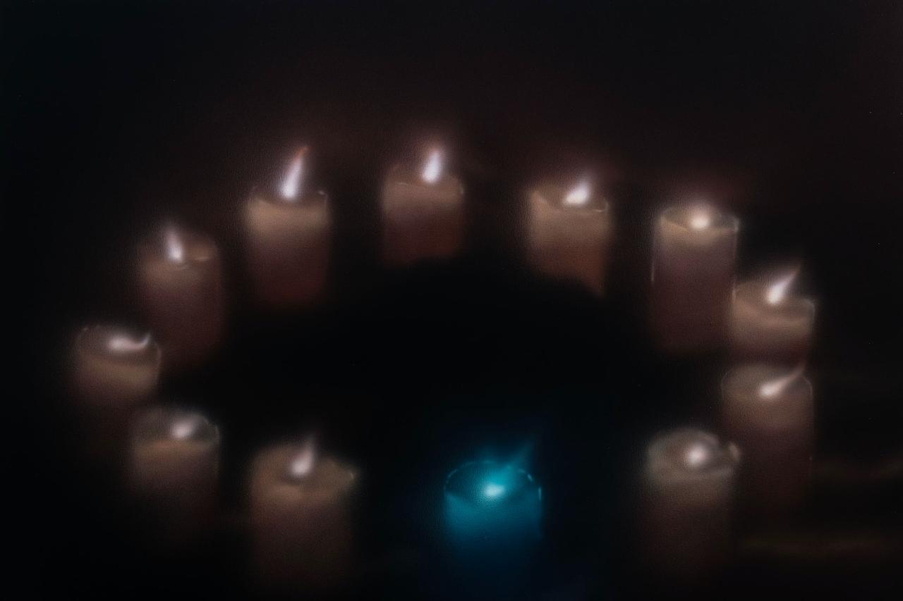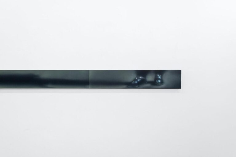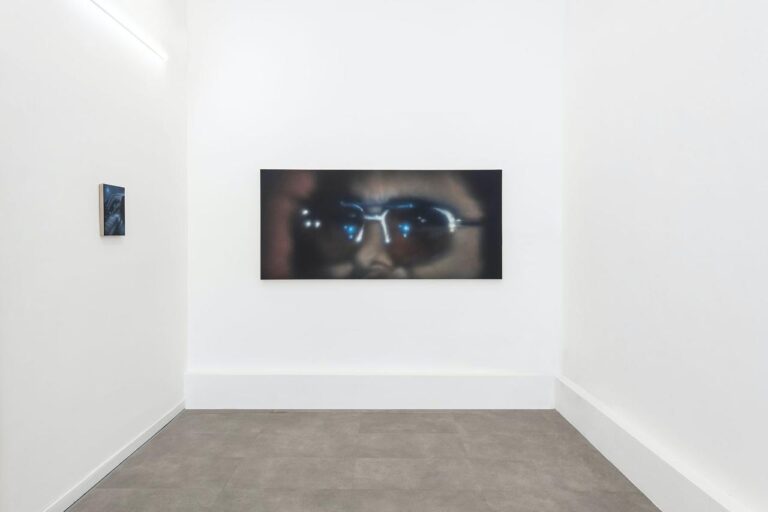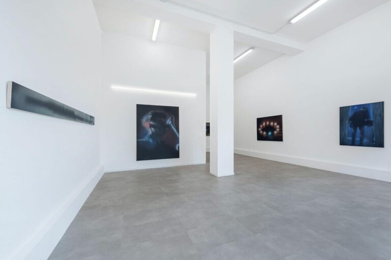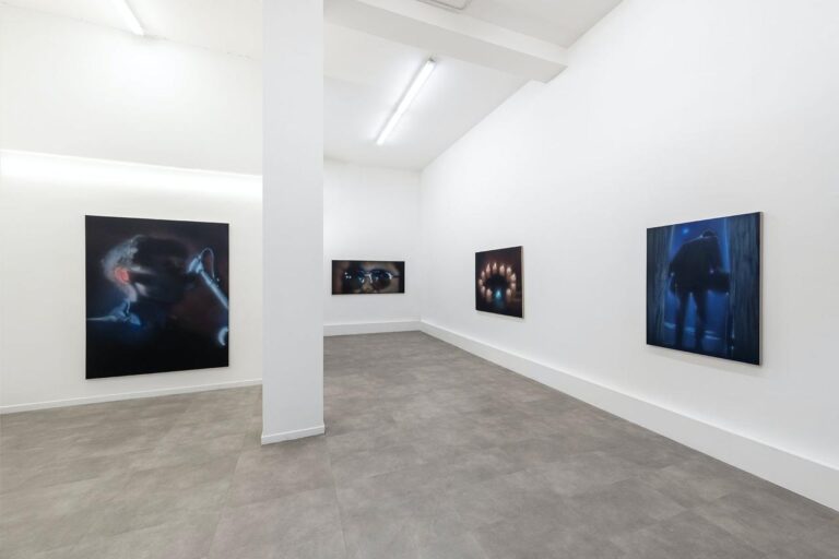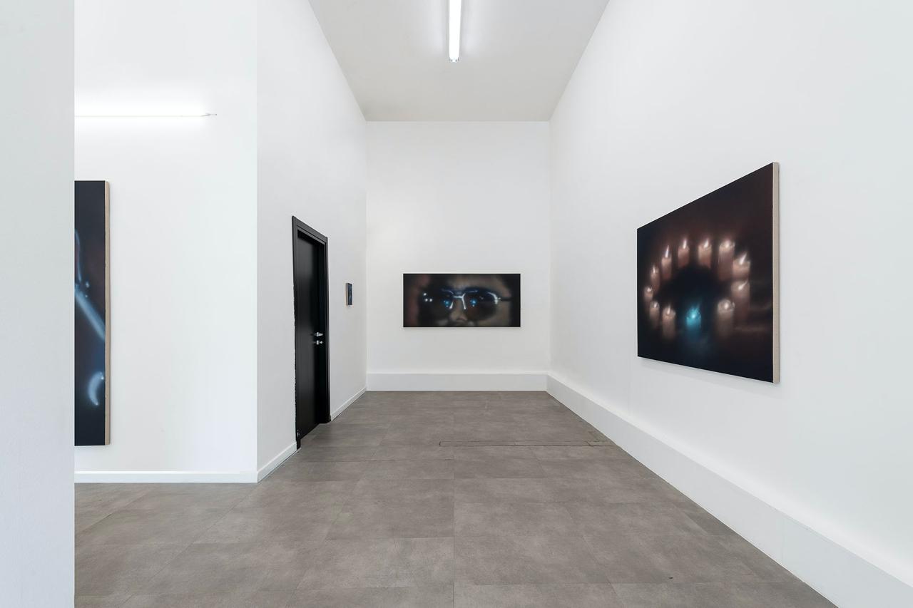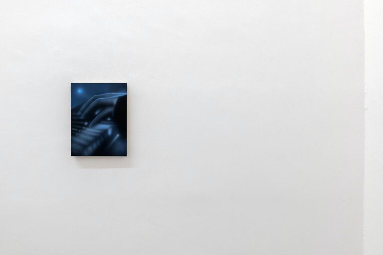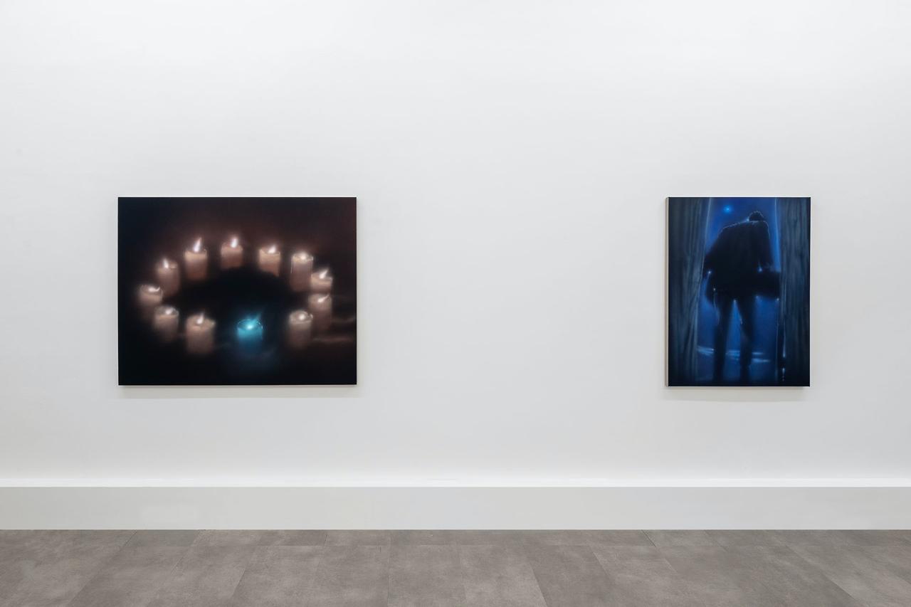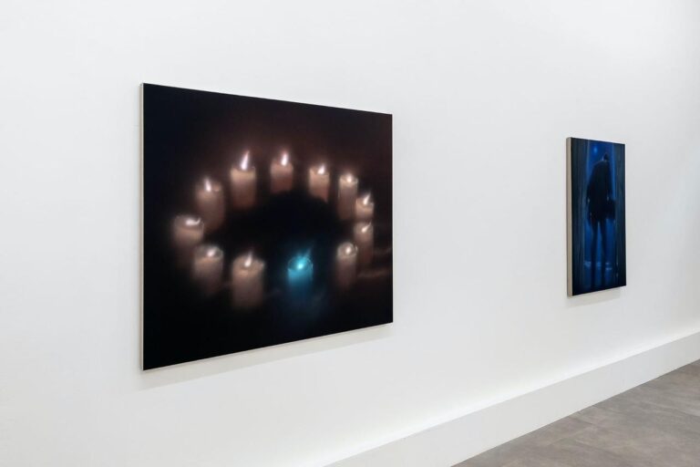 In the body of works made for this exhibition – five paintings and a few additional works – male figures is still the subject that interests the artist the most. Nevertheless, Buscemi is also interested in interiors scenes and objects, like in the work I Don’t Know What to Do with the Fire, which portrays twelve candles placed in circle. The blue candle in the foreground immediately stands out, and gives the artist the chance to investigate light and reflection.